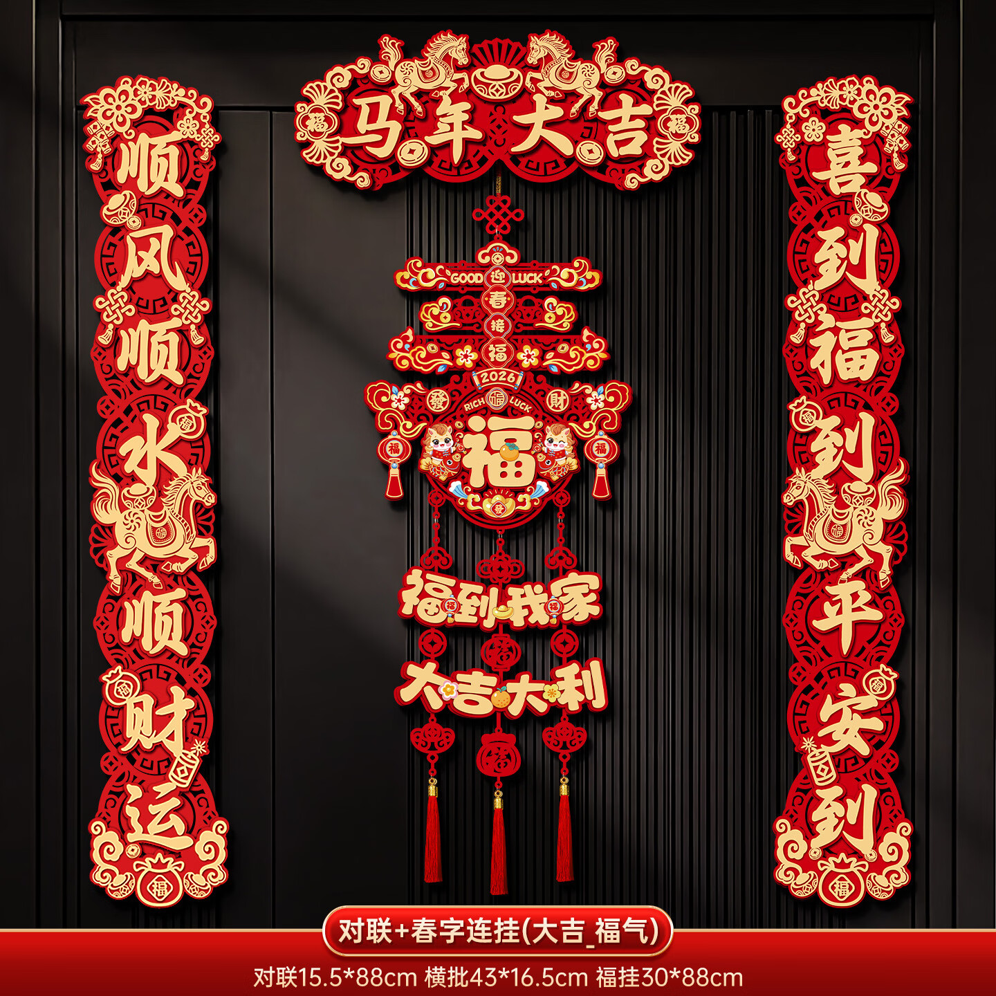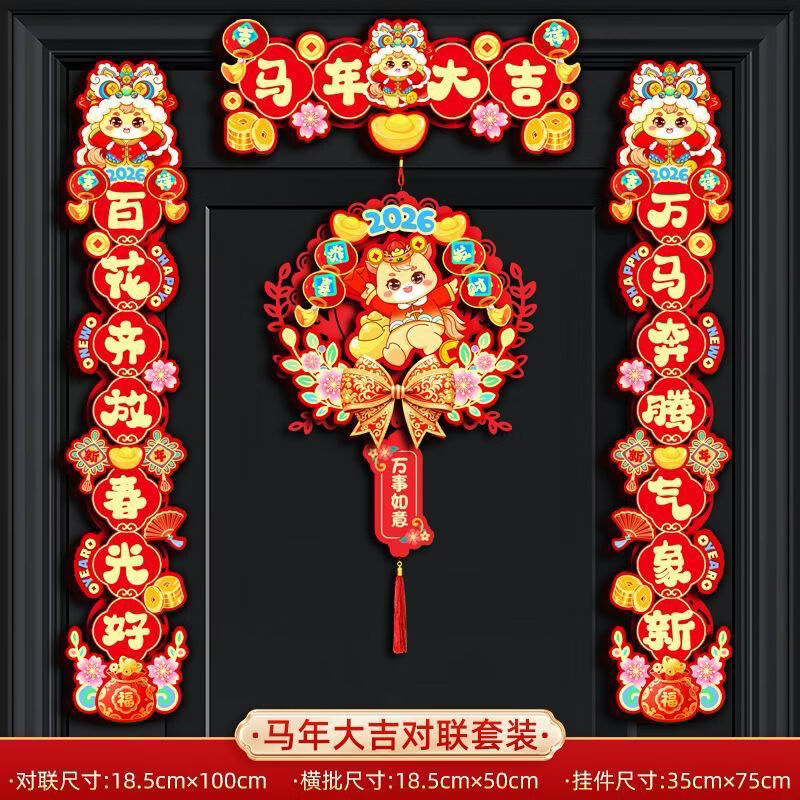 【厂家直发】2026新款马年对联春联批货春节过年创意卡通福字门贴 对联+春字连挂【大吉福气】 马年对联【粘胶款】